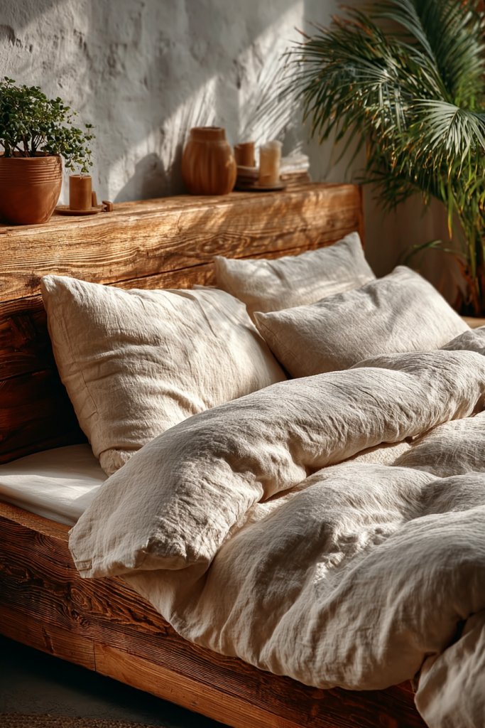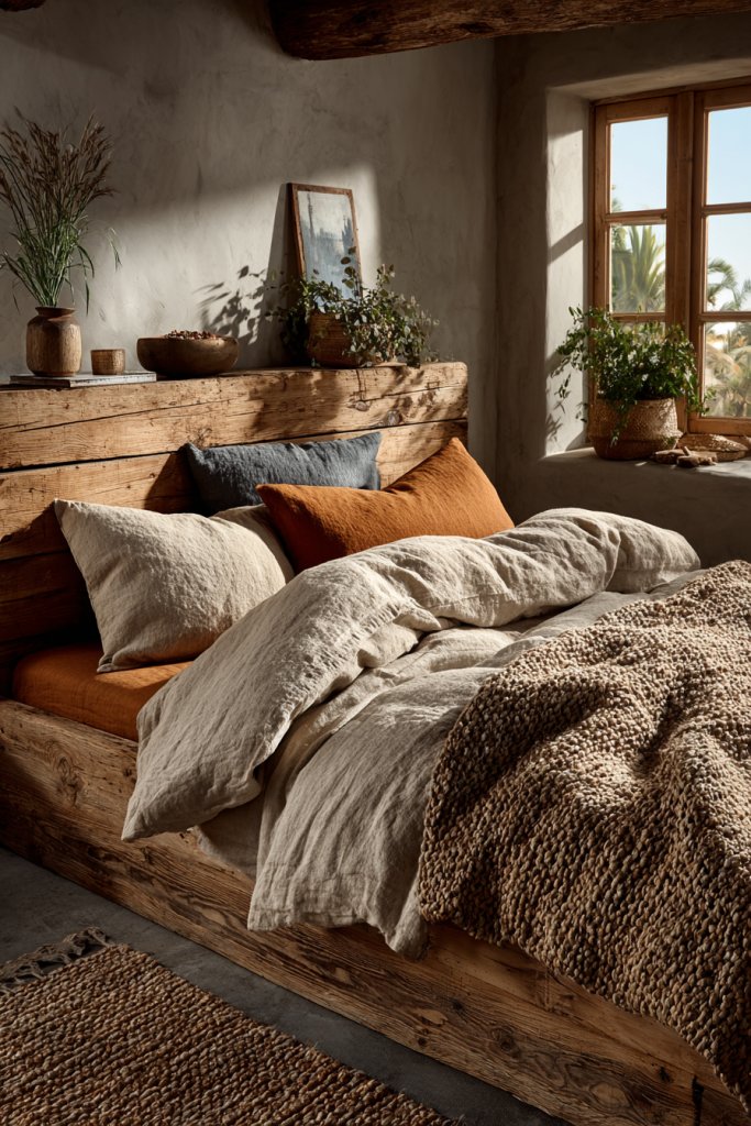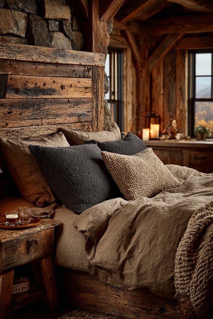 Imagine a sturdy wooden frame with a weathered finish, paired with a large, textured headboard made from reclaimed planks. The natural knots and imperfections tell stories of the wood’s history. Soft, neutral bedding in linen or cotton complements the rustic look. Warm lighting enhances the natural wood tones.