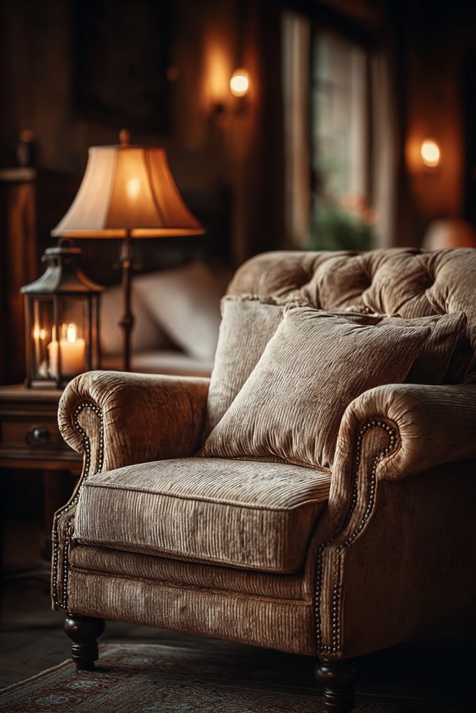 Picture a plush fabric headboard in velvet or linen, edged with metallic nailhead accents. The frame boasts a rich, textured appearance, inviting you to sink in. Warm lighting highlights the intricate details, creating a cozy, nostalgic atmosphere. Accents like vintage lamps or ornate mirrors enhance the overall aesthetic.