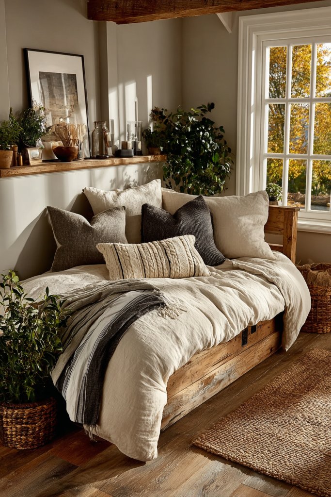 Decorate with textured cushions, embroidered covers, or layered throws. Use warm lighting—such as sconces or bedside lamps—to emphasize the cozy nook. Incorporate a small side table or ottoman for practicality. Personal touches like family photos or heirloom pieces elevate the charm.