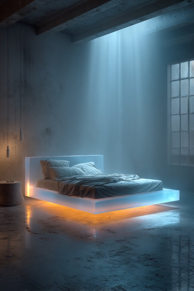 Imagine a bed seemingly suspended above the floor, with soft LED strips concealed beneath the frame. The lighting casts a gentle, customizable hue that bathes the room in a calming glow. The clean edges and minimal hardware highlight the floating effect. Surrounding decor remains simple to amplify the illusion.