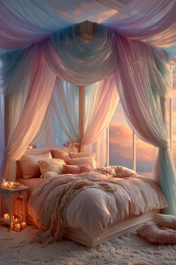Visualize a sturdy frame draped with flowing, translucent curtains in soft pastel or neutral shades. Gentle light filters through the fabric, casting a glow that feels warm and inviting. The canopy’s posts can be decorated with delicate garlands or fairy lights for extra charm. Plush bedding and decorative pillows complete the scene.