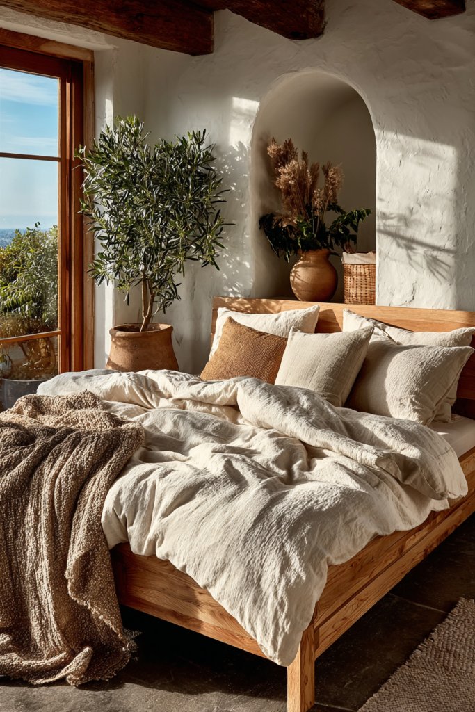 Add personal touches such as handmade cushions or heirloom quilts. Incorporate a mix of vintage and new decor items. Use a variety of textiles in different textures for a rich sensory experience. Play with layering and asymmetry for a relaxed, boho vibe.