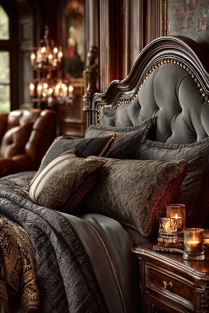 Choose deep, rich colors like burgundy, navy, or emerald for a dramatic look, or go neutral with soft beiges or greys for versatility. Incorporate layered bedding with embroidered or patterned covers. For a shabby chic vibe, add distressed furniture or decorative antique accessories. Seasonal changes can be made with different pillow styles and throws.
