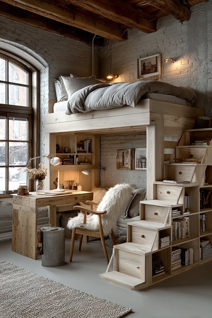 Living in a small space and craving both sleep and productivity? A loft bed with integrated workspace and storage solves that dilemma. It maximizes vertical space, giving you a dedicated area for work or study without sacrificing bedroom comfort. Perfect for students or tiny home enthusiasts.