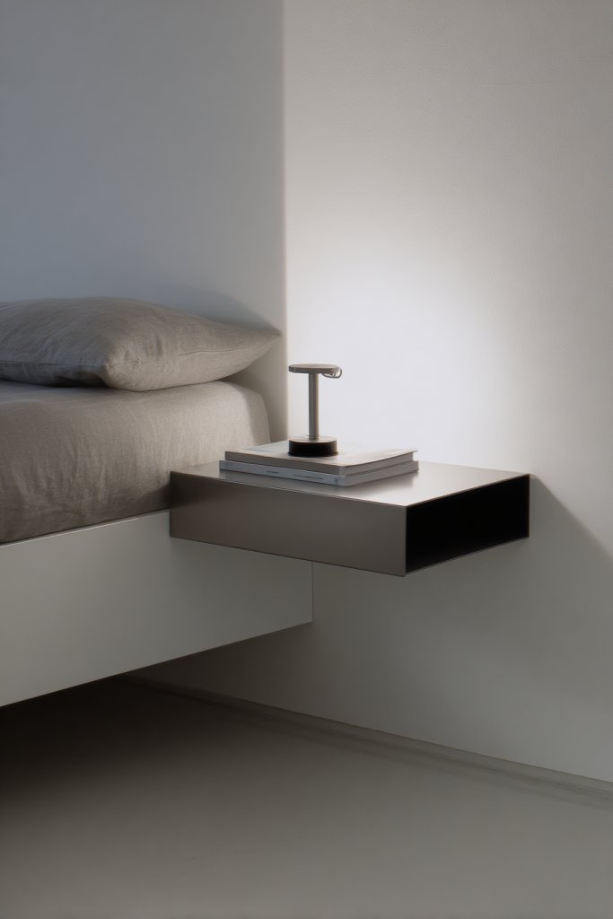 Imagine a slim, wall-mounted shelf with a matte finish, positioned beside your bed. It holds a small lamp, a book, and a decorative object—all neatly arranged without taking up any floor space. The lack of legs or bulky bases creates a floating effect that emphasizes openness. The clean lines and simple design integrate seamlessly into contemporary decor, making your room look fresh and uncluttered—like a high-end hotel suite.