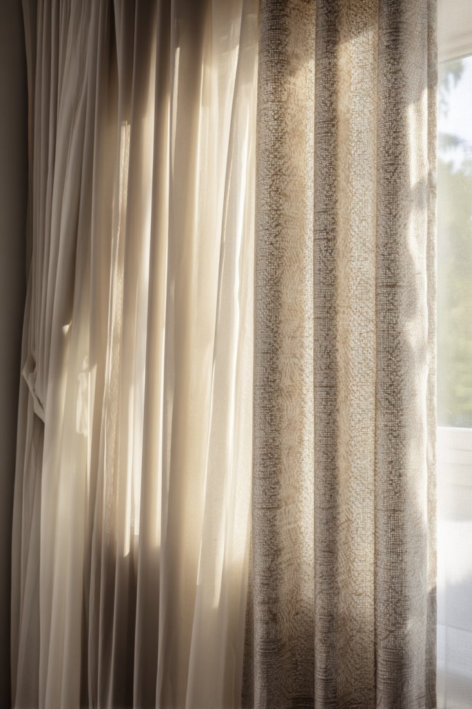 Imagine sheer, flowing curtains in a light, airy fabric layered with heavier drapes in a plush velvet or textured linen. The layering creates visual depth, with the translucent fabric softly diffusing sunlight and the heavier fabric adding richness. When drawn, the curtains frame your window beautifully, casting gentle shadows and creating a warm glow. The textures and fabrics invite touch and add a tactile layer to your decor. The overall effect is a bedroom that feels warm, layered, and inviting.