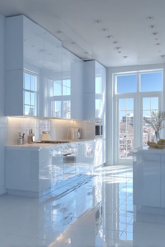 Imagine smooth, reflective surfaces that bounce light across the room, making the space appear larger and brighter. The high-gloss finish creates a mirror-like effect, capturing the surrounding colors and textures for a dynamic look. The handleless design emphasizes clean lines, giving your kitchen a seamless, uninterrupted flow. It’s like a piece of modern art you can cook in.