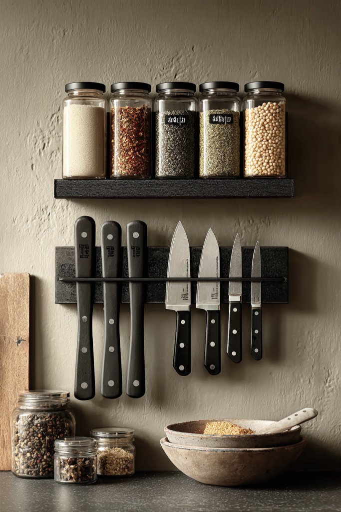 Imagine sleek metal magnetic strips mounted on a backsplash, holding knives safely and stylishly. Nearby, a slim spice rack with glass jars neatly labeled adds a pop of color and order. The vertical arrangement creates a clutter-free countertop while showcasing your tools and ingredients. The overall effect is both functional and visually appealing.