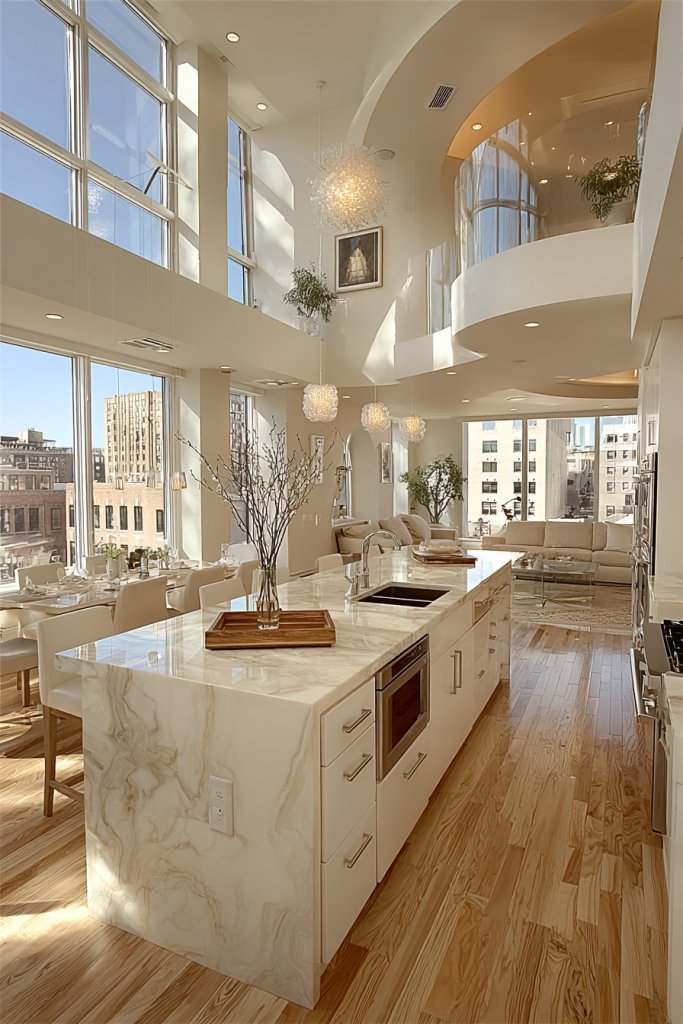 Visualize a spacious kitchen seamlessly flowing into a living or dining area, with no barriers or closed doors. Light-colored cabinets and countertops reflect sunlight, enhancing the openness. A large island doubles as a social hub, with bar stools inviting guests to chat while you cook. Soft rugs and layered lighting define different zones within the open space.