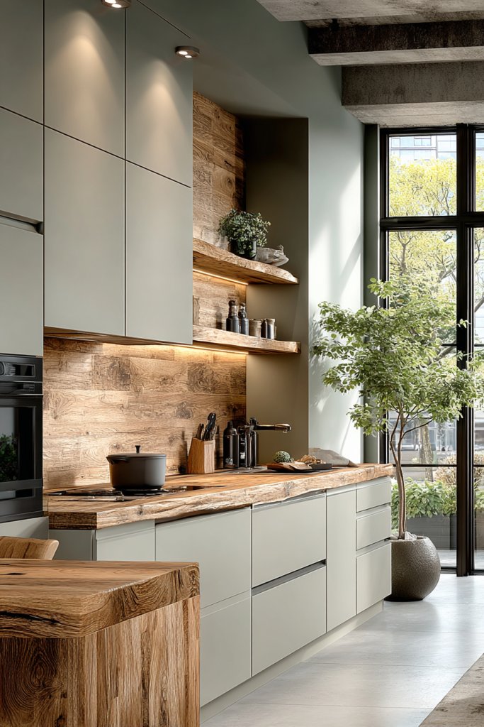 Imagine soft taupe or greige matte cabinets paired with natural wood open shelves or trim. The matte finish absorbs light, reducing glare and adding depth, while the warm wood tones introduce texture and coziness. Subtle brass or black hardware enhances the look without overpowering the calm palette. It’s a blend of modern and rustic that feels both fresh and familiar.