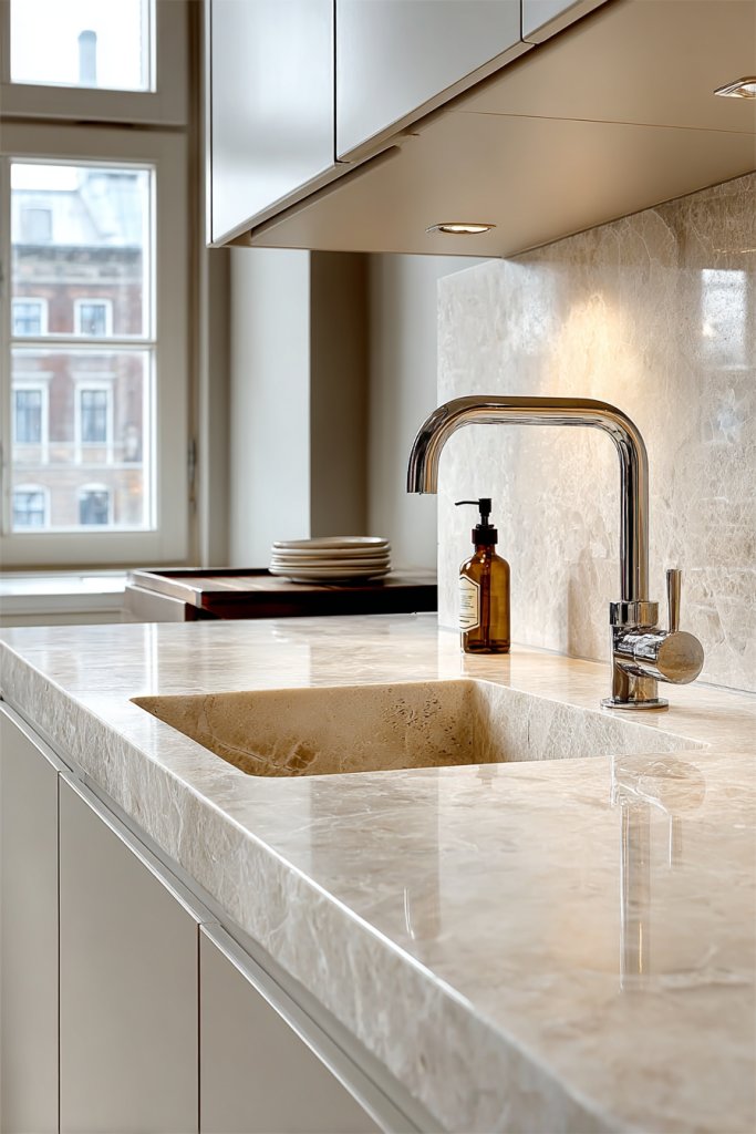 Imagine a sink flush with your countertop, with no visible edges or seams. The smooth surface extends to the backsplash, creating a streamlined, cohesive appearance. A matte or polished finish enhances the minimalist vibe. The overall effect is a sleek, uncluttered workspace that’s as functional as it is beautiful.