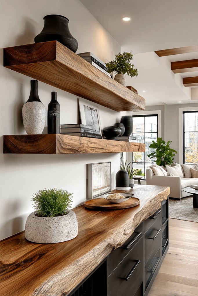 Picture rustic wooden shelves with a matte finish mounted seamlessly against a textured backsplash. Brightly colored bowls, curated jars, and neatly arranged plates turn into eye-catching decor. Metal brackets in matte black or brass add a modern edge to the warmth of wood. The open design invites you to showcase your personality while making daily routines smoother.
