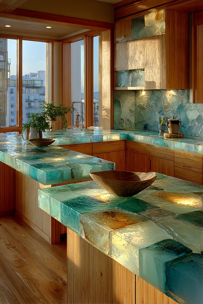 Imagine countertops with shimmering flecks of recycled glass embedded in a clear or tinted resin, catching light beautifully. Bamboo cabinets bring warmth with their natural grain and soft color palette. The combination creates a fresh, organic vibe that’s both modern and earthy. This look pairs well with neutral tones and minimalist decor.