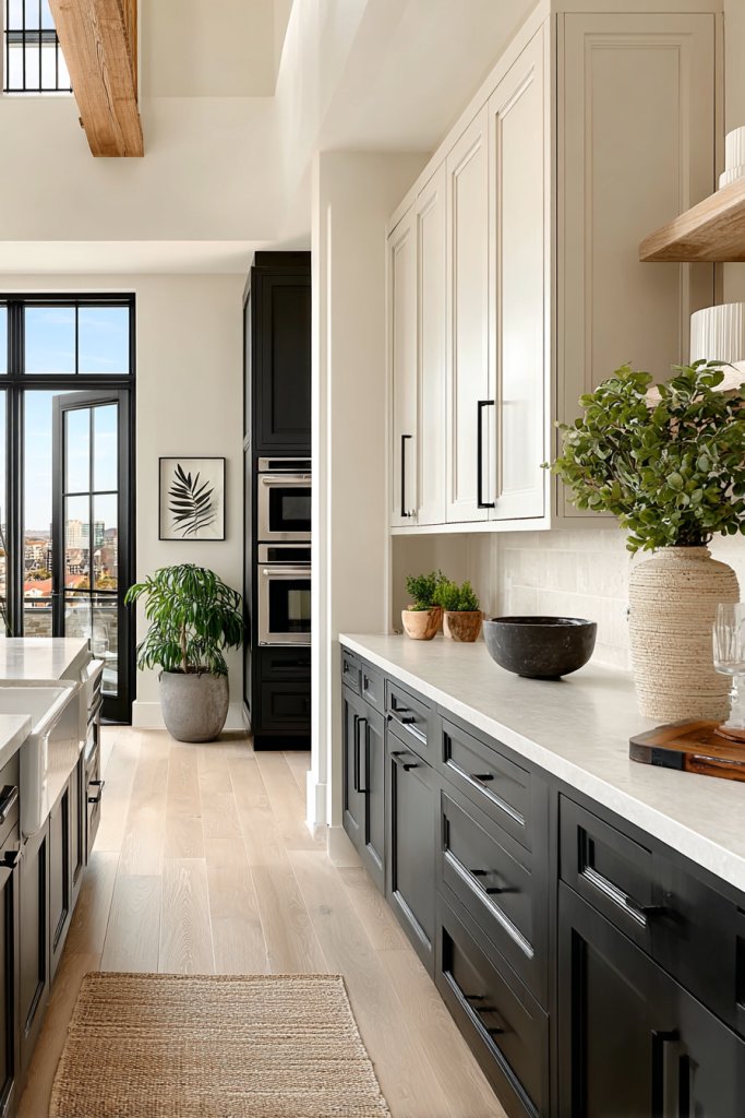 Visualize white or light-gray upper cabinets paired with dark navy or charcoal lower units. The contrast draws your eye across the room, highlighting architectural details. Open shelving or glass-front cabinets in the upper section add lightness, while matte dark bases ground the design. The effect is modern, balanced, and inviting.