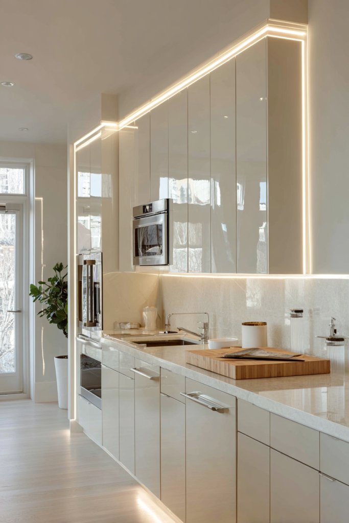 Imagine a row of slim LED strips tucked neatly beneath your upper cabinets. The light spills evenly over countertops, eliminating shadows and dark corners. The subtle glow creates a warm, welcoming ambiance that makes cooking feel less like a chore. The sleek, minimal fixtures blend seamlessly into the cabinetry, maintaining a clutter-free look.