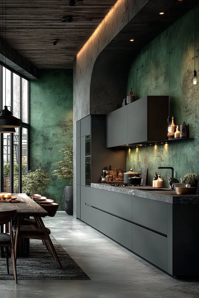 Picture a sleek kitchen painted in soft matte gray, with one wall painted in a deep navy or emerald green as an accent. The contrast adds drama and focus, drawing the eye to a specific area or feature. Matte finishes reduce glare, while the bold accent wall creates a sense of depth and richness. The overall effect is modern, sophisticated, and undeniably eye-catching.