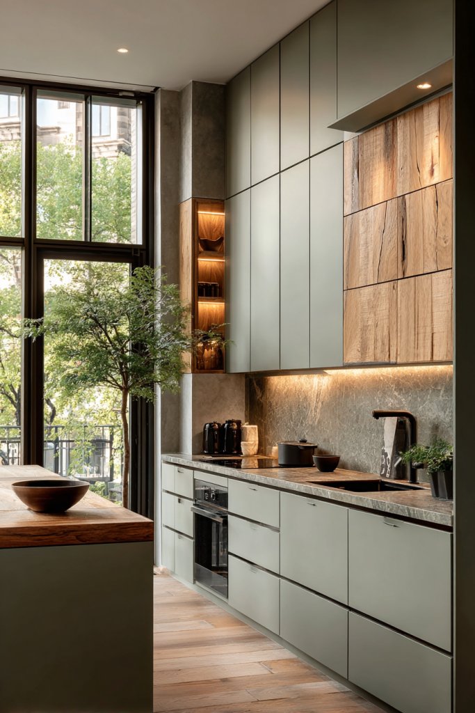 16. Neutral-toned, matte-finish cabinetry paired with warm wood accents for balance
