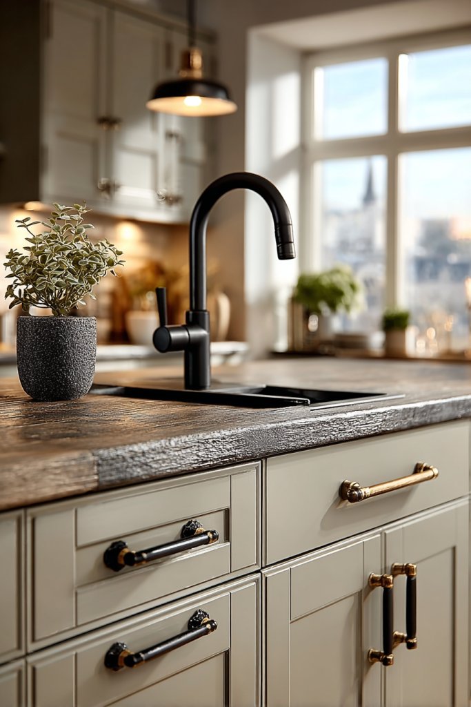 Personalize your fixtures with unique shapes or textured designs. Use contrasting metals elsewhere, like brushed brass knobs or copper accents, for a curated look. Incorporate matte black accessories, like utensil holders or storage jars, to reinforce the theme. Small details add up to a polished, cohesive kitchen aesthetic.