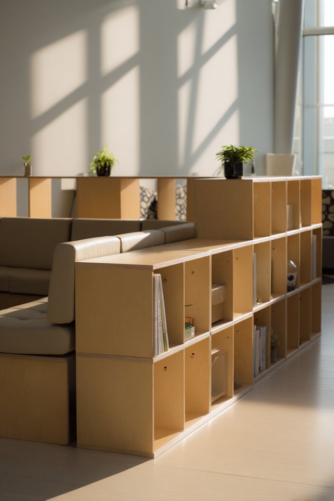 Visualize a series of cube units arranged in a grid or staggered formation, acting as a room divider. You can leave some cubes open for display or add doors or drawers for concealed storage. Decorate the tops with baskets, books, or decorative objects—avoiding restricted items—to personalize your partition. It’s a playful yet practical solution.
