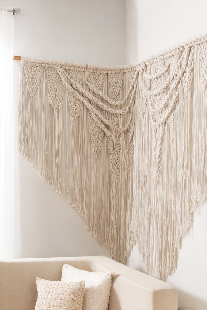 Picture a large, intricate macramé panel hanging as a soft barrier between your living and dining areas. The knotted patterns and fringe details create visual movement and warmth. When light hits the textured fibers, it casts subtle shadows, enhancing depth. The hanging acts as a focal point, drawing attention to your handcrafted style.