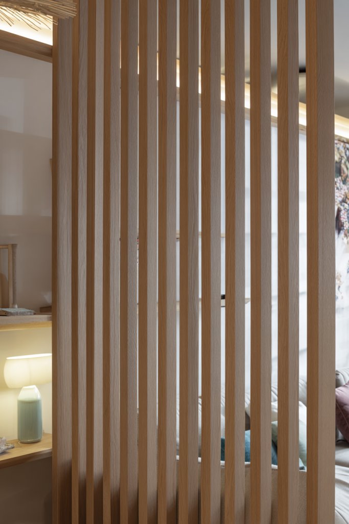 Visualize a series of slim, evenly spaced wooden slats standing tall between your living and dining areas. The natural grain and finish add texture, while the gaps allow light and air to flow freely. The design offers privacy without creating a sense of confinement. When sunlight filters through, it casts subtle shadows adding depth.