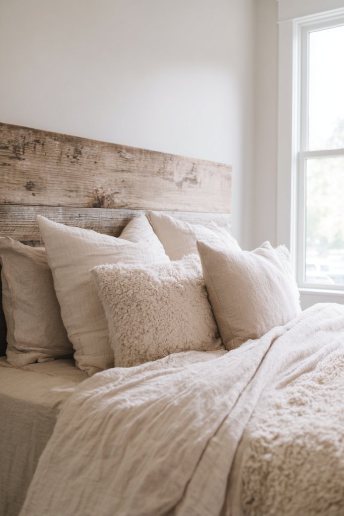 1. Reclaimed Wood Headboard with Neutral Bedding