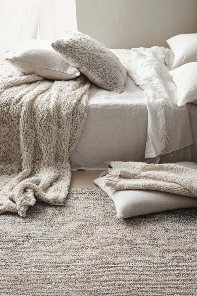 Imagine a plush, textured rug in neutral tones lying beneath a bed dressed in layered quilts, throws, and an array of pillows. The different fabrics—knit, cotton, faux fur—create a tactile feast for the senses. Natural light highlights the layers, making the room look cozy and sophisticated. It’s a space that beckons you to relax and unwind.