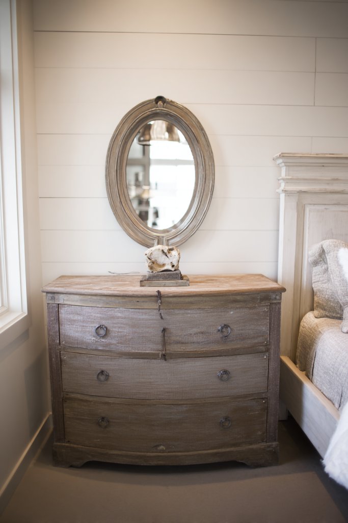Imagine a distressed wooden dresser with antique hardware, topped with a vintage mirror in an ornate frame. The mirror’s weathered finish reflects soft natural light, making the room appear larger and brighter. Textured bedding and rustic accents complete the scene, creating a harmonious blend of function and style. The overall look is inviting, nostalgic, and full of character.