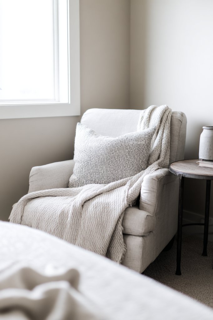 Imagine a plush armchair with soft, textured fabric in a neutral tone, nestled in a corner near a window. A cozy throw blanket drapes over the arm, inviting touch, while a small side table holds a cup of tea or a favorite book. The space is completed with layered cushions and a warm rug underneath. Soft lighting or a nearby floor lamp adds to the inviting atmosphere.