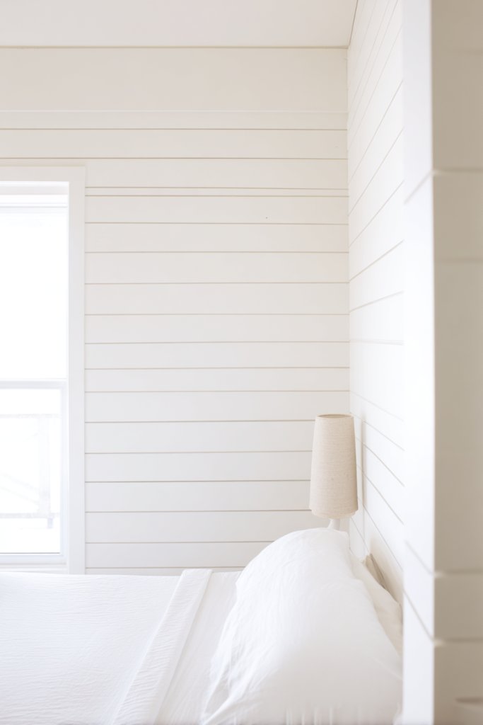 Picture a single wall covered in horizontal shiplap painted in a crisp, matte white. The panels create subtle shadows and lines that add depth, reflecting natural light beautifully. Layered with cozy bedding, a textured rug, and neutral accents, the room feels spacious and inviting. The clean lines of the shiplap contrast nicely with softer textiles, balancing rustic with modern.