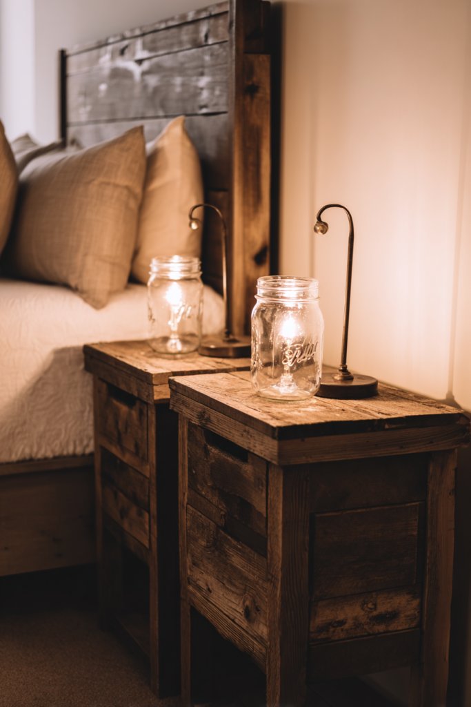 Picture distressed wooden nightstands with simple, natural finishes. On top, mason jar lamps with exposed filament bulbs cast a warm, inviting glow, perfect for reading or relaxing. The combination of rough wood and glass adds rustic charm, while soft bedding and textured rugs complete the inviting scene. The overall vibe is warm, welcoming, and full of personality.
