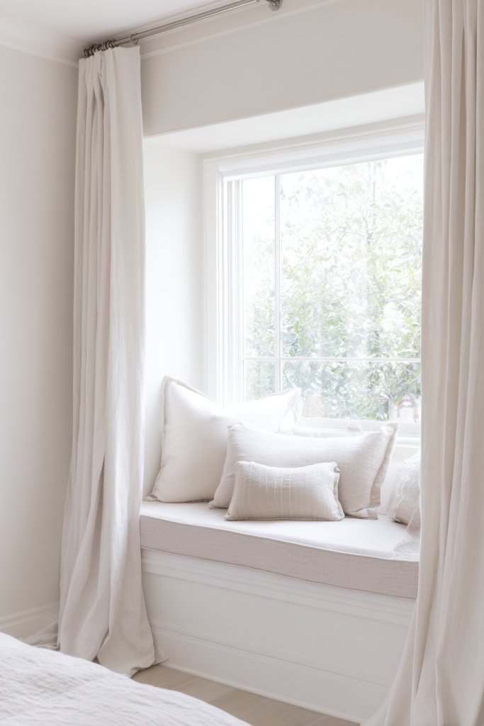 Imagine a soft, cushioned window seat layered with plush pillows in neutral tones and textured fabrics. Light, airy curtains flutter gently in the breeze, framing the view and softening the room’s edges. The scene invites you to curl up with a book, sip tea, or simply enjoy the sunlight. This corner feels intimate and inviting, a little haven within your bedroom.