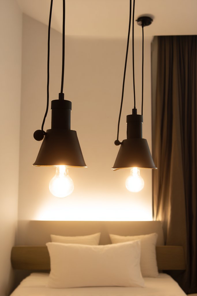 Picture sleek black or matte-finish pendant lights hanging on either side of your bed, casting warm pools of light. The fixtures feature simple, modern shapes—think metal or glass—that complement rustic wood or painted walls. The soft glow highlights textured bedding and layered textiles, creating a layered, inviting atmosphere. The room feels balanced, modern, and cozy all at once.