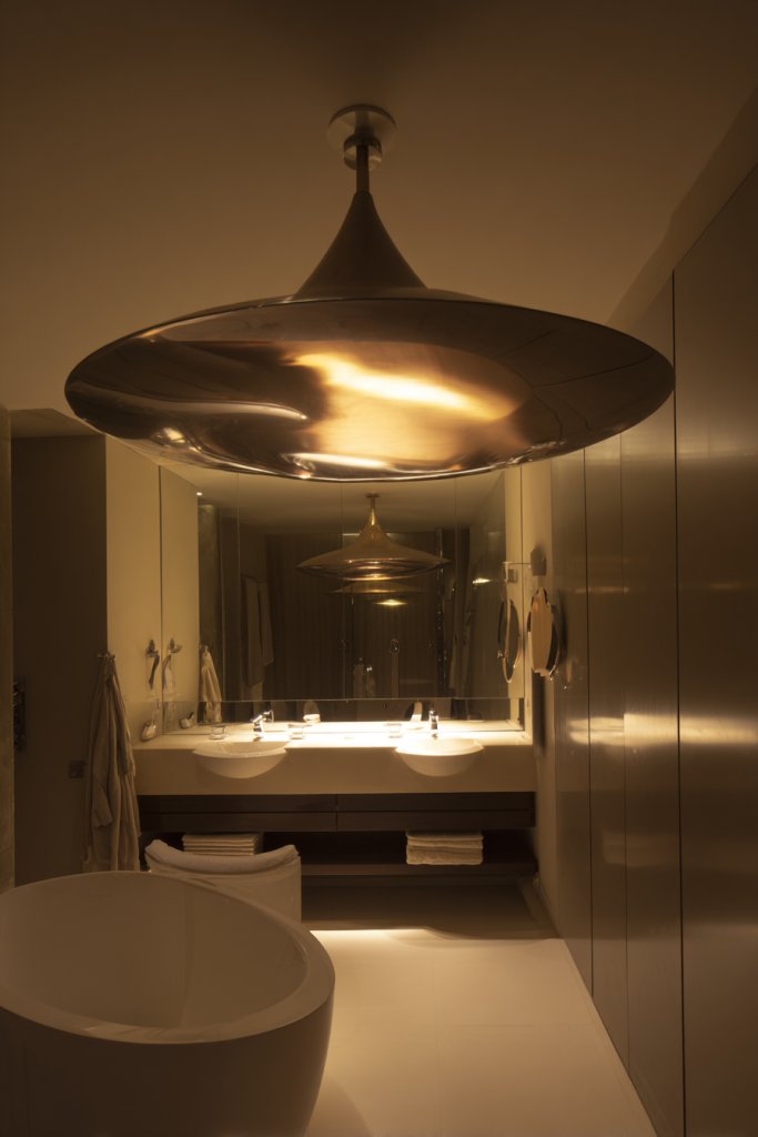 Visualize a sculptural pendant hanging gracefully above your vanity or soaking tub, crafted from high-end materials like brass or frosted glass. Its design draws the eye, becoming a focal point in the room. Soft, diffused light spills out, creating a warm, inviting glow. The fixture’s unique shape and finish complement other luxe details in the space.