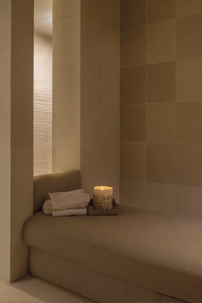 Imagine a built-in or water-resistant upholstered bench nestled in a corner or along a wall. Soft cushions and textured throws invite you to sit and breathe. The surrounding tiles are soothing, with warm tones and gentle lighting. It’s a cozy nook that transforms your bathroom into a personal spa.