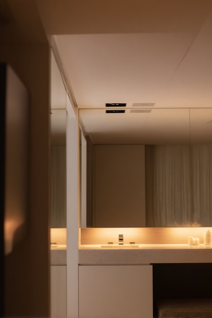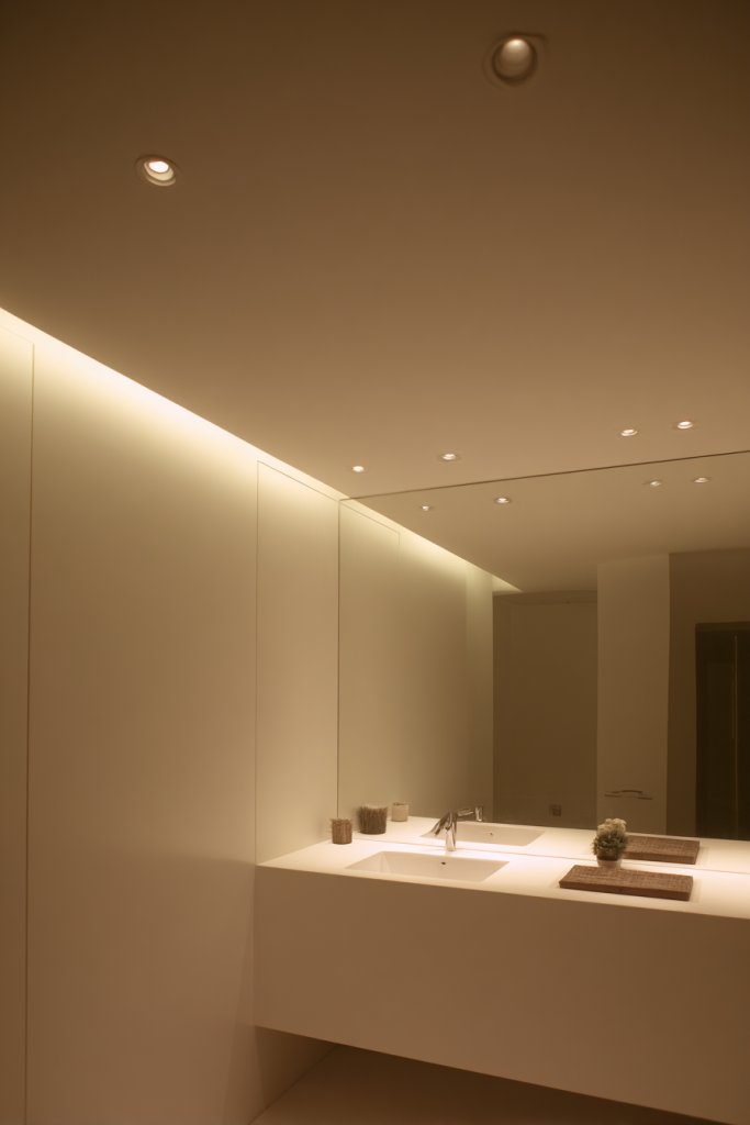Visualize soft, warm light streaming from discreet ceiling fixtures, casting a gentle glow across the room. At night, you switch to a dimmer setting, turning the space into a tranquil retreat. The sleek, flush design of the lights blends seamlessly into the ceiling, avoiding clutter and maintaining a minimalist aesthetic. The layered lighting enhances textures and architectural details, elevating the space.