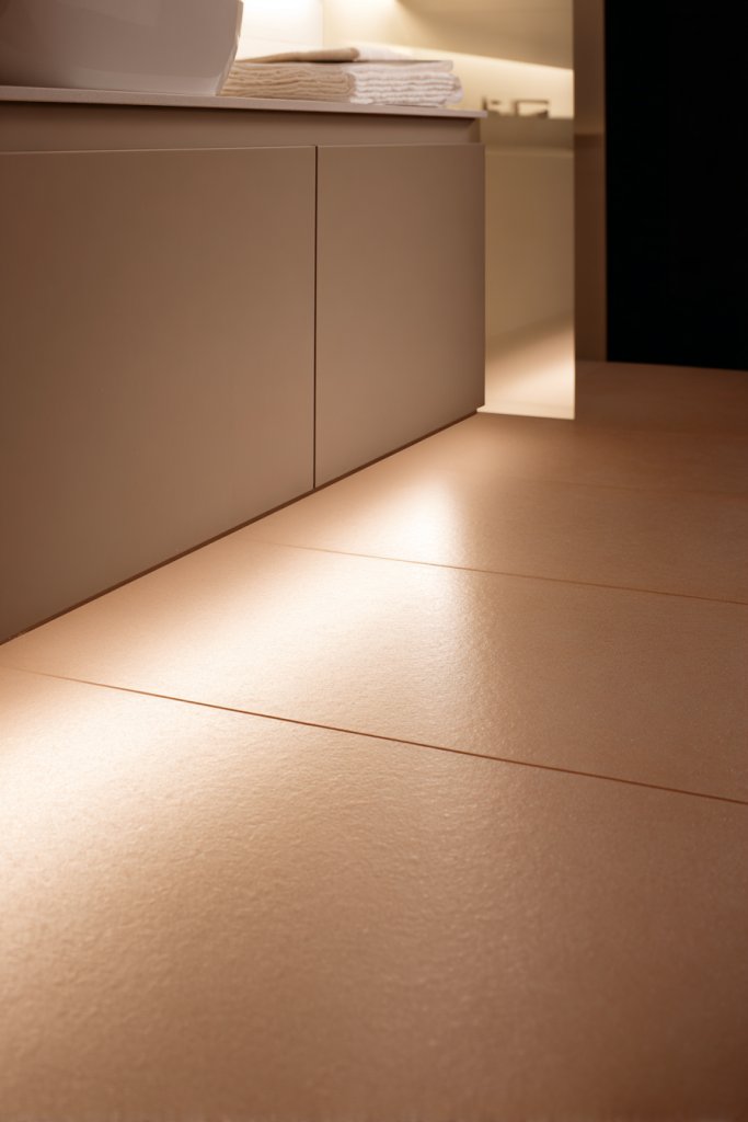 Picture polished porcelain tiles in large formats with subtle veining or textured engineered wood planks that mimic natural hardwood. The seamless surface reflects light, making the room feel larger and brighter. Warm tones add coziness, while textured finishes provide grip and visual interest. The overall effect is a sophisticated, durable floor that anchors your design.