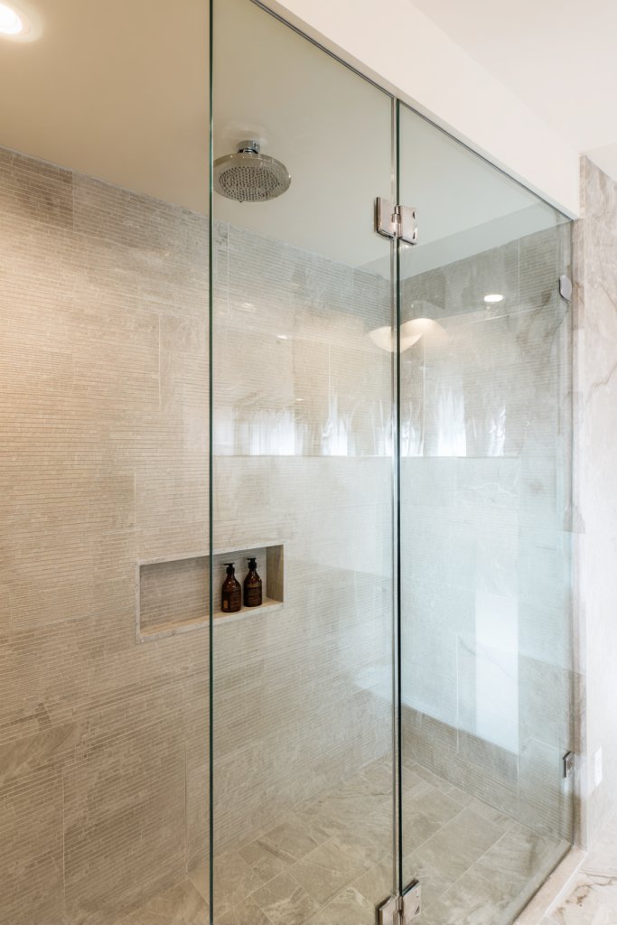 Add a textured glass or frosted panel for privacy without sacrificing openness. Incorporate a handheld shower wand for versatility. Opt for a sleek, matching faucet and controls in your preferred finish. Keep the space clutter-free with built-in niches or shelves that are water-resistant and seamless.