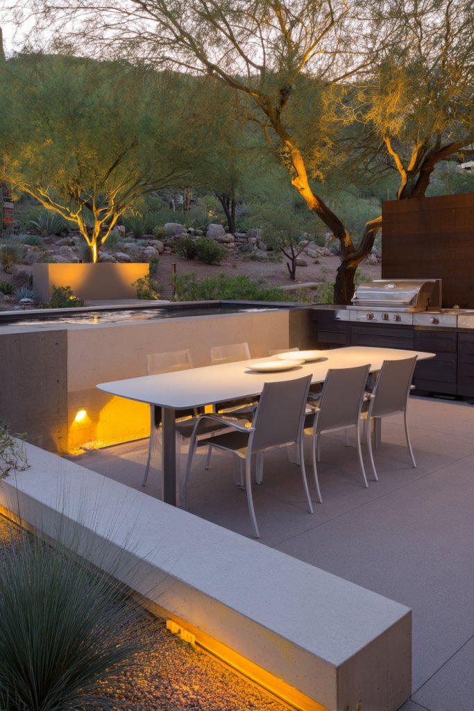Picture sleek, weather-resistant furniture in neutral tones arranged around a built-in grill or fire feature. A modern pergola with minimalist columns provides shade while maintaining open sightlines. The space incorporates textured paving, like large concrete slabs or patterned tiles, adding visual interest. Ambient lighting—such as hidden LED strips or sleek lanterns—casts a warm glow after sunset. Sculptural planters or water features add a sense of artistry and tranquility.