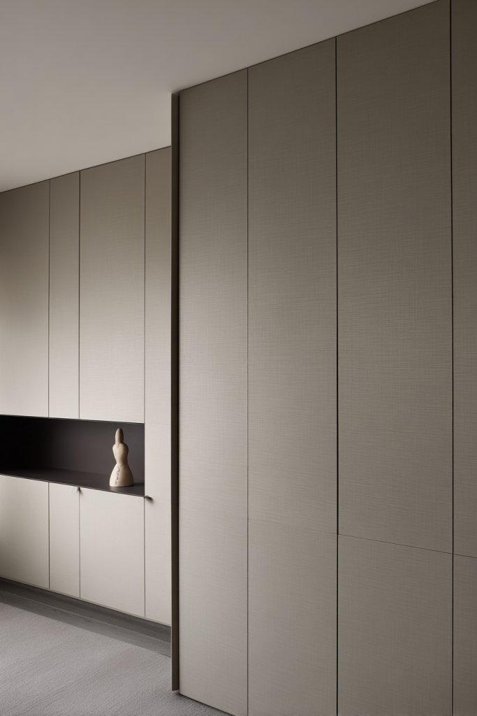Imagine a spacious closet with built-in cabinets that stretch to the ceiling, finished in high-gloss lacquer or textured wood. Glass-fronted drawers and open shelving display your favorite accessories, while hidden compartments keep less-used items out of sight. LED lighting illuminates every corner, showcasing your wardrobe like a boutique display. Soft textiles, like a plush rug and cushioned seating, add comfort and luxury. The overall effect is a sleek, organized sanctuary for your wardrobe.