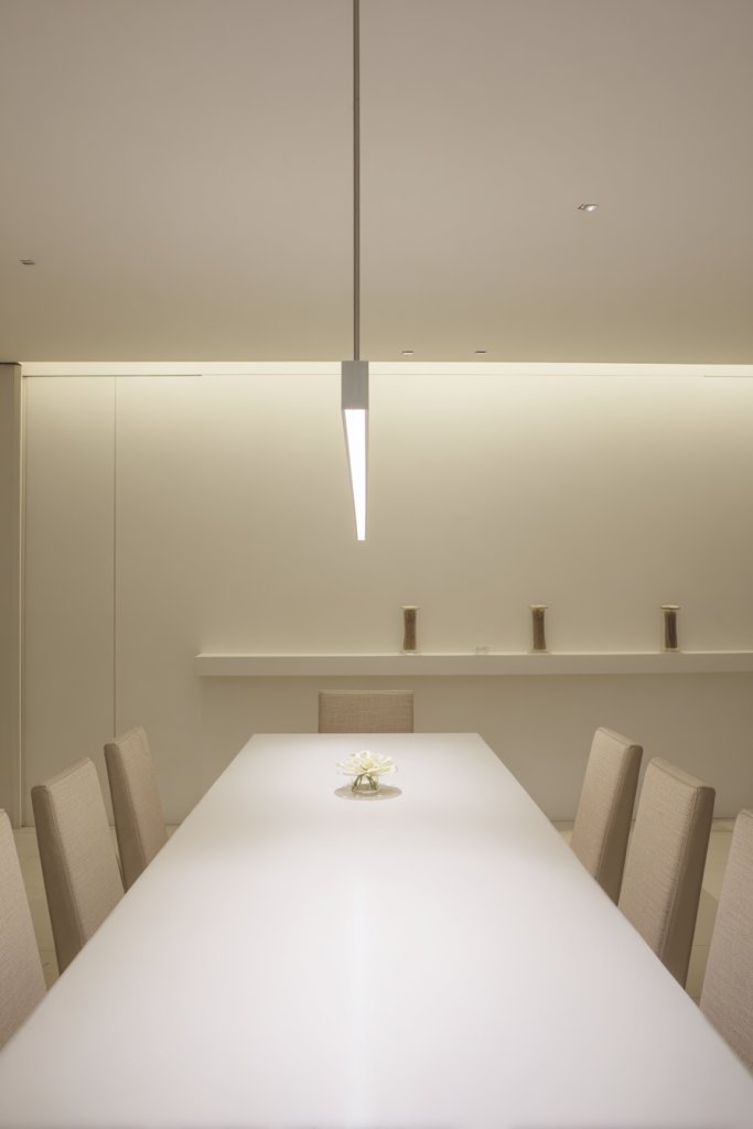 24. Elegant, Minimalist Dining Area with Modern Lighting