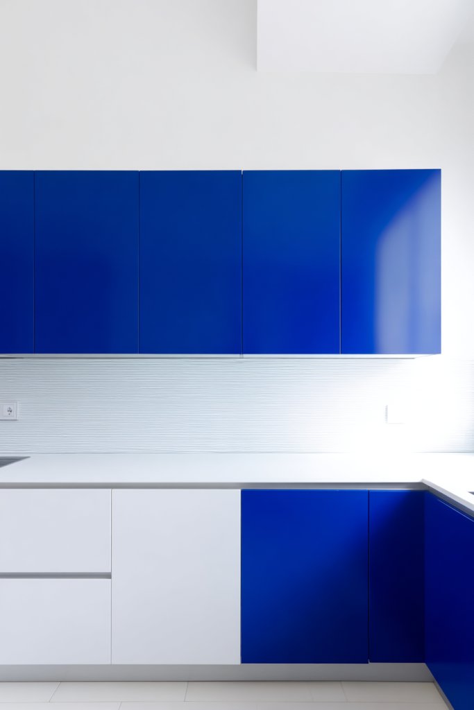 Imagine navy or cobalt cabinets paired perfectly with crisp white countertops and backsplashes. The deep blue adds a sense of sophistication, while white keeps everything light and airy. The glossy finish on the cabinets reflects sunlight, making the space look bigger. Accentuate with subtle metallic handles, and you’ve got a sleek, energetic kitchen that feels both modern and inviting. It’s a visual treat that balances boldness with freshness.