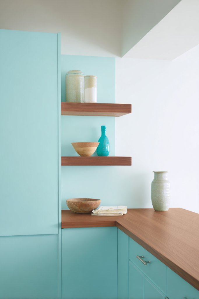 This scheme suits beach houses, modern coastal, or Scandinavian styles. For a more playful twist, include coral or sandy beige accents. During different seasons, change textiles or accessories to reflect the weather—think light fabrics in summer or cozy throws in winter. In smaller kitchens, keep the aqua shades soft and pair with minimalistic walnut shelving. Larger spaces can incorporate statement artwork or textured wall finishes.
