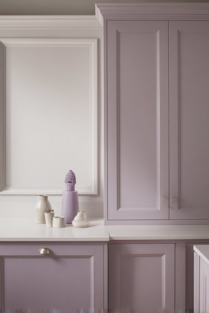 Imagine lavender cabinetry in a matte or satin finish paired with beige or taupe walls and countertops. The gentle purple adds a touch of luxury, while the neutrals keep everything grounded. Textured textiles like linen or silk curtains enhance the sophisticated vibe. Accentuate with delicate metallic hardware—rose gold or brushed nickel—to add a feminine touch. The overall atmosphere is quiet, graceful, and inviting.
