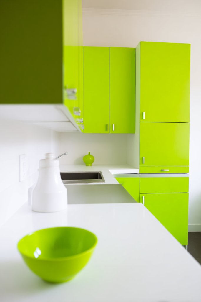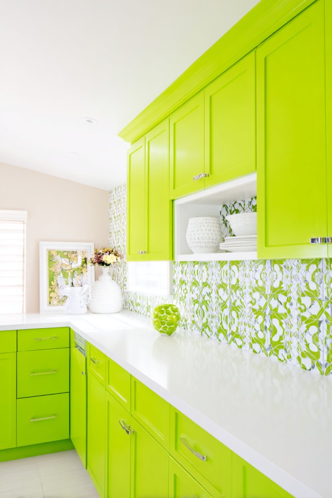 Picture lime green cabinets with a matte or semi-gloss finish, contrasted with white countertops and walls. The bright green adds a punch of vitality, while white keeps the overall look clean and spacious. Consider patterned backsplash tiles or a colorful mosaic to add visual excitement. Accessories like colorful bowls or utensils can further enhance the lively atmosphere. The space feels fresh, energetic, and full of life.