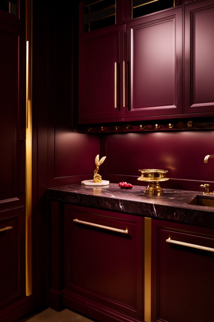 Select a rich burgundy for your cabinetry—preferably with a matte finish for a sophisticated vibe. Pair with high-quality quartz or marble countertops with subtle gold veining. Hardware should be in gold or brass—handles, knobs, and fixtures—to enhance the luxe theme. For the backsplash, consider a simple, elegant tile or a metallic finish. Use layered lighting—pendants or under-cabinet LEDs—to highlight the richness of the colors. Layout should emphasize symmetry and cleanliness.