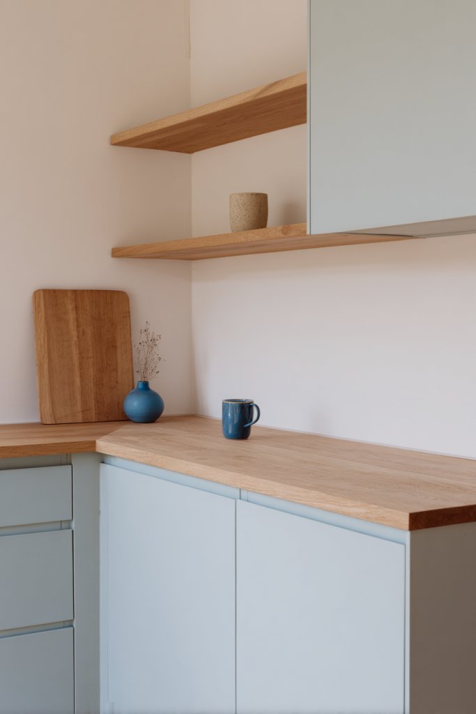 Choose pale blue for your cabinetry—consider matte finishes for a soft look. Pair with oak countertops that showcase the natural grain for warmth. Hardware should be sleek—think black or brushed nickel handles. Use a simple, neutral backsplash—like white subway tiles—to keep the focus on the colors. Layered lighting—pendant lights or under-cabinet LEDs—will enhance the airy, calm vibe. Keep the layout open and uncluttered.