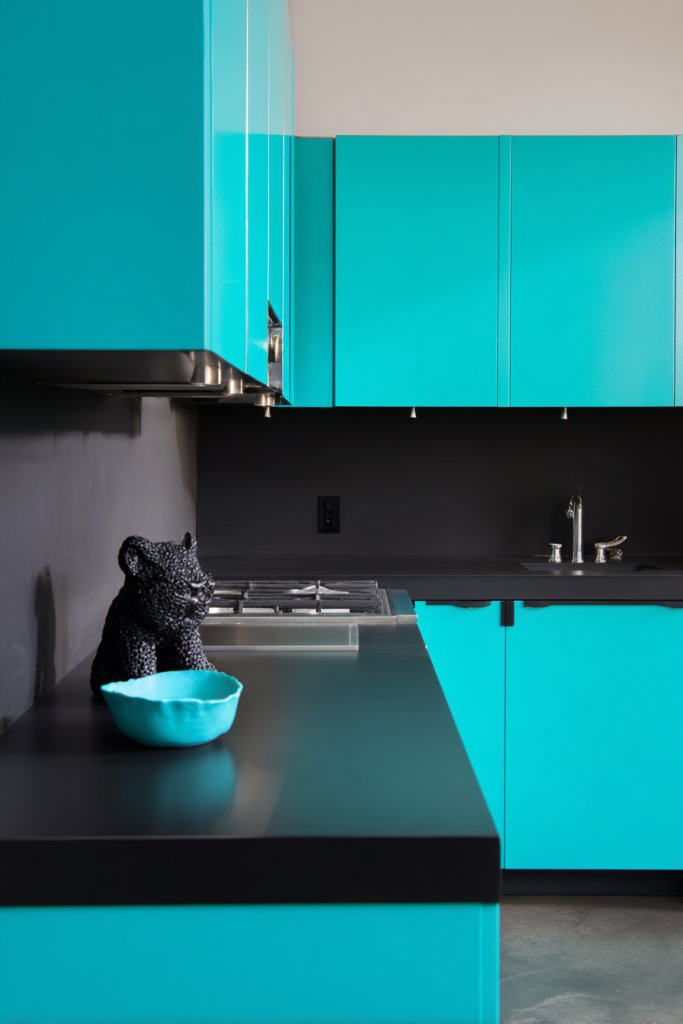 Visualize vivid turquoise cabinets with a matte finish paired with black countertops and fixtures. The matte black adds sophistication and depth, balancing the lively turquoise. Incorporate textured tiles or a patterned backsplash in black and gray for visual interest. Metal fixtures, like black or gunmetal, enhance the modern aesthetic. The overall look is bold, sleek, and endlessly stylish—a true contemporary statement.