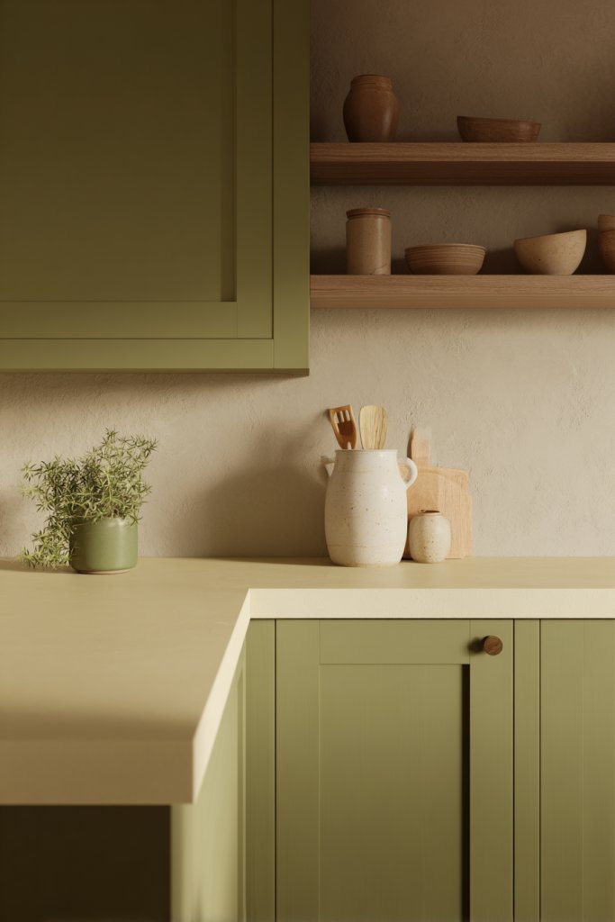Imagine olive green cabinets with a matte finish combined with creamy countertops and walls. The earthy tone adds depth, while the cream keeps the space light and airy. Incorporate natural textures like woven baskets or wooden accents. Finish with vintage-inspired hardware—brass or bronze—to enhance the rustic charm. The overall look is warm, organic, and welcoming—a true retreat from the hustle.