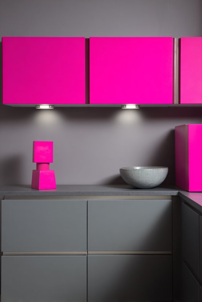 Picture neon pink cabinets with a matte or semi-gloss finish contrasted against sleek gray countertops and walls. The neon pink injects energy and excitement, while gray tones keep the look balanced and sophisticated. Incorporate geometric or abstract backsplash tiles in gray and white for added visual interest. Accessories like vibrant dishware or quirky decor enhance the playful vibe. The overall aesthetic is fresh, youthful, and undeniably fun.
